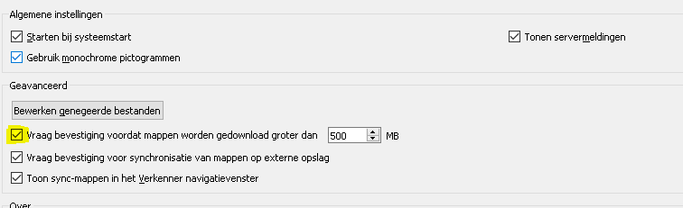 - Er is ingesteld dat mappen boven een bepaald formaat niet mogen synchroniseren. Klik op het icoon in de taakbalk en ga naar instellingen