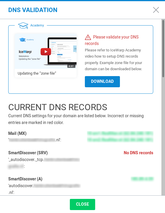 "VALIDATION" -> CURRCENT DNS RECORDS moeten allemaal groen zijn. Wanneer u de bovenstaande DNS regels hebt ingesteld kan het even duren voordat deze actief worden.