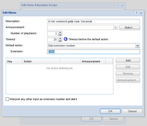 • Selecteer bij ‘Default Action’ ‘Dial extensionnumber’ en voer als extensie 7201 in en klik op ‘Ok’