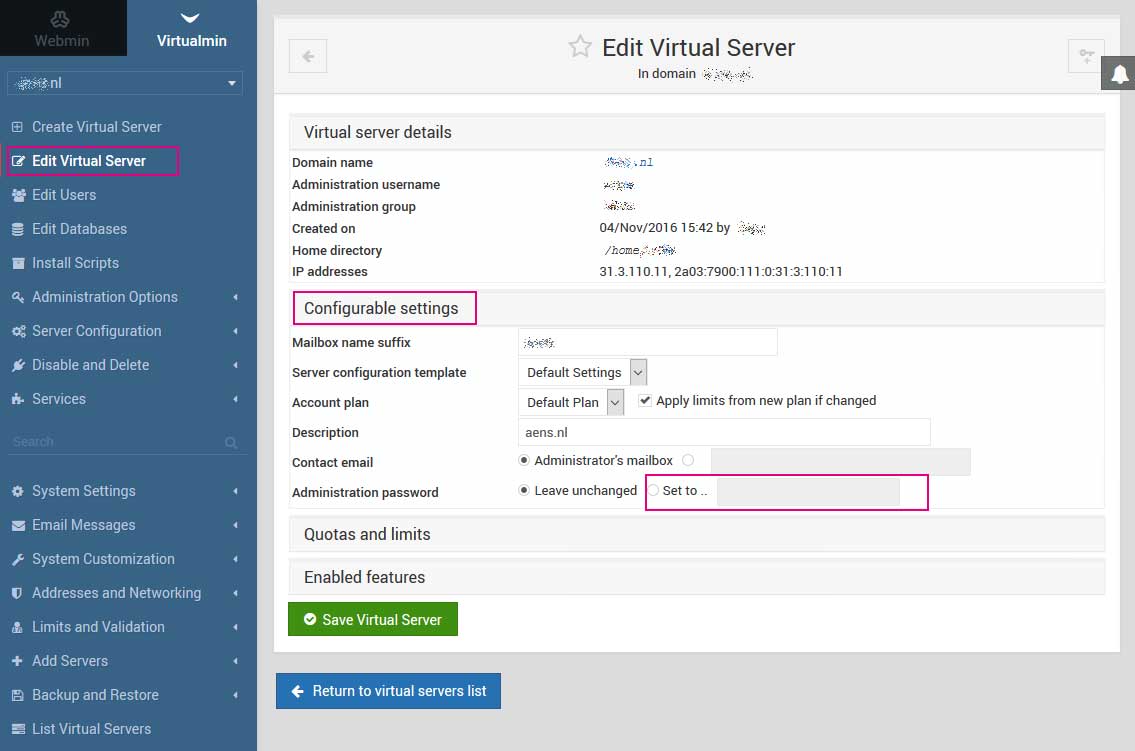 Bewerk de virtuele server waarvan je het wachtwoord wil wijzgen.