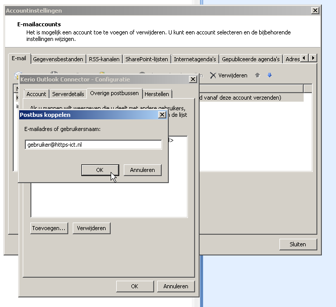 - Geef de inlognaam van diegene in de een map gedeeld heeft en klik op ok, nogmaals op ok en op sluiten. U heeft nu weer gewoon Outlook zonder open vensters