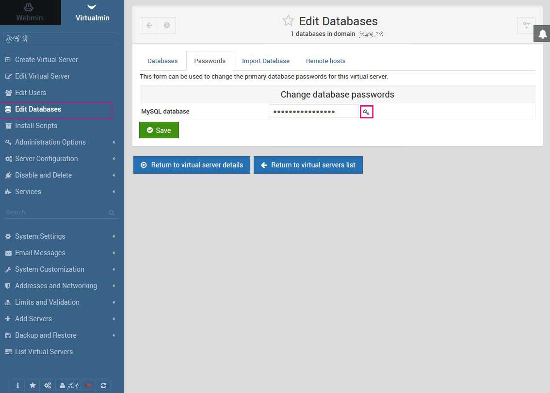 Kies de virtual server waarvan je het wachtwoord voor de database wil wijzigen of inzien.