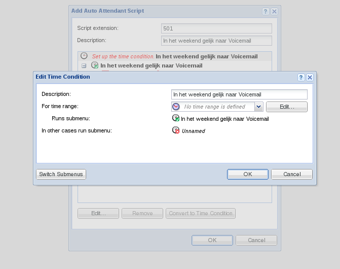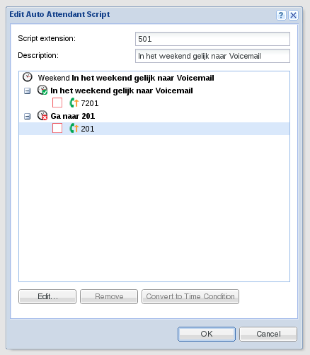 De casus is dat we één toestel op extensie 201 hebben. Van vrijdag 17:30 tot maandag 08:30 uur willen we dat er direct naar voicemail geschakeld wordt. Buiten die tijden moet toestel 201 gewoon overgaan en moet de voicemail het oppakken als er niet bijtijds opgenomen wordt.