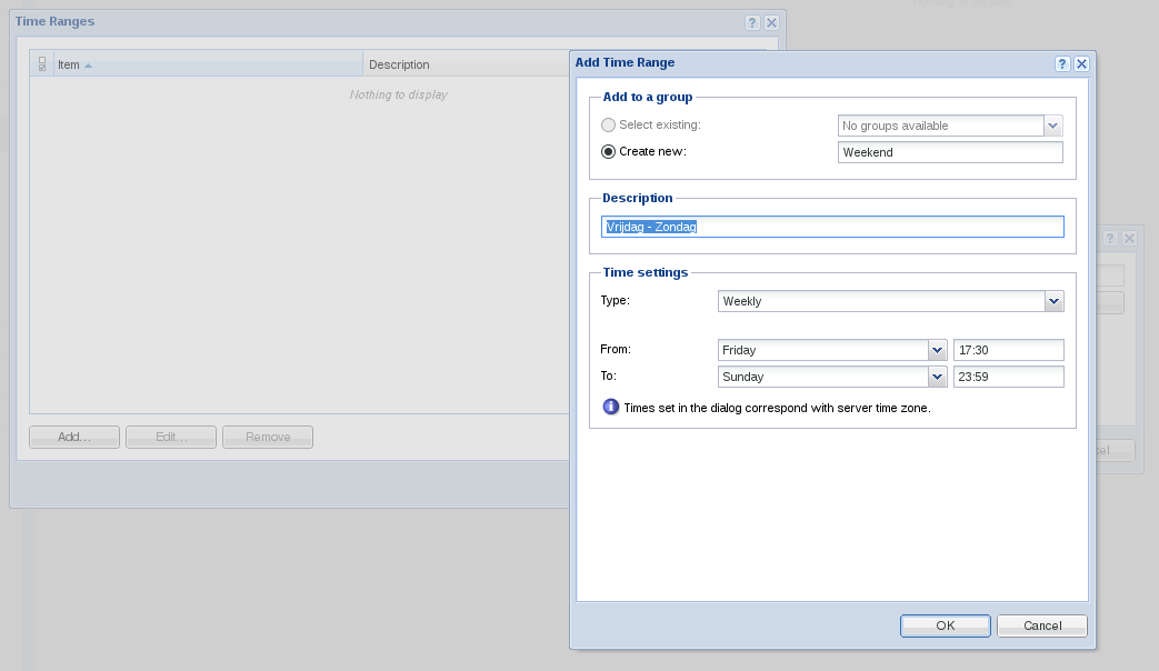 We kunnen nu een groep aanmaken met tijds-gebaseerde voorwaarden, waarop het IVR-menu besluiten kan nemen. Wij willen van vrijdagmiddag tot maandagmorgen direct naar voicemail, dus maken we daar een groep voor aan. We kunnen (helaas) niet van vrijdag naar maandag gaan, dus maken we twee regels aan: