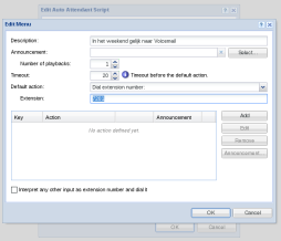 - Selecteer bij ‘Default Action’ ‘Dial extensionnumber’ en voer als extensie 7201 in en klik op ‘Ok’